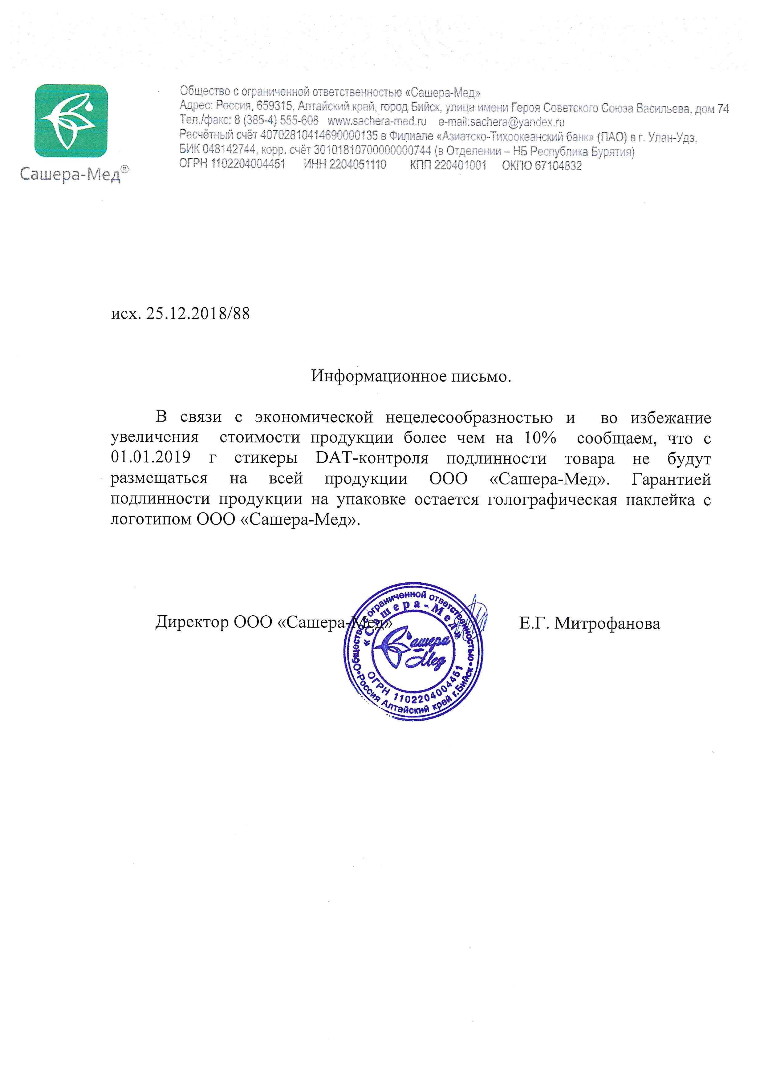 Многие уже обратили внимание, что на последних партиях отсутствует код безопасности для проверки подлинности продукта. Спешим развеять сомнения : в целях экономии в компании отказались от стикеров DAT-контроля, однако на упаковке по прежнему остается голографическая наклейка с логотипом ООО "Сашера-Мед".