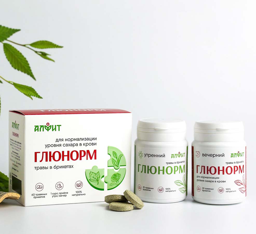Комплекс «Глюнорм» содержит 60 брикетов по 2 грамма, включает в себя 2 вида брикетированных сборов – «Глюнорм утренний» и «Глюнорм вечерний», упакованных в полиэтиленовые банки с захлопывающимися крышками. Каждая банка содержит 30 брикетов по 2 грамма.