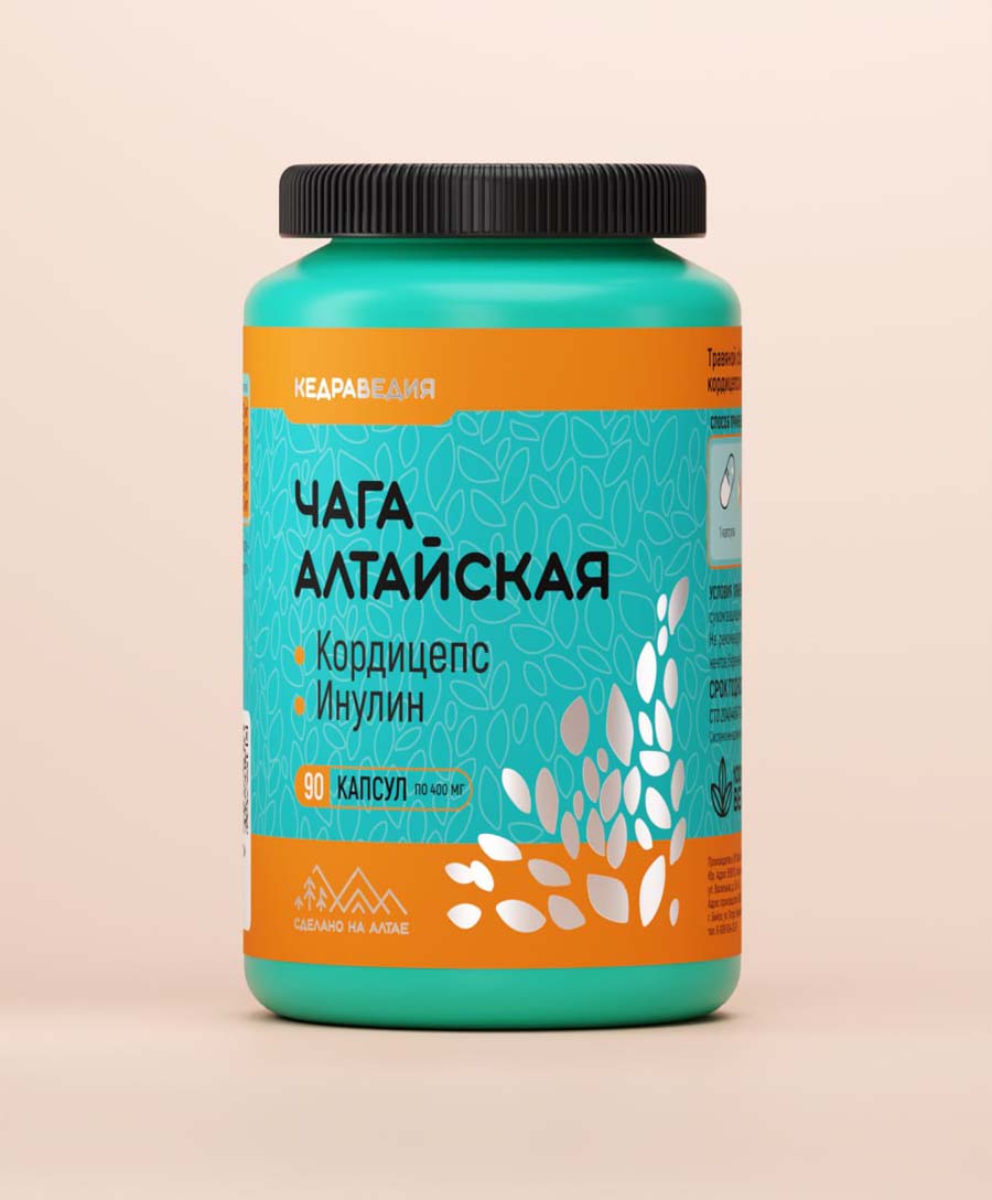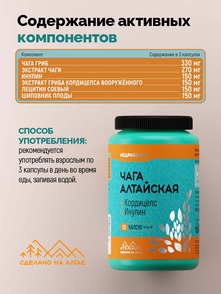 СОСТАВ: чага гриб, экстракт чаги, экстракт гриба кордицепса вооруженного, инулин, лецитин соевый, шиповник плоды; капсула (растительная целлюлоза*).